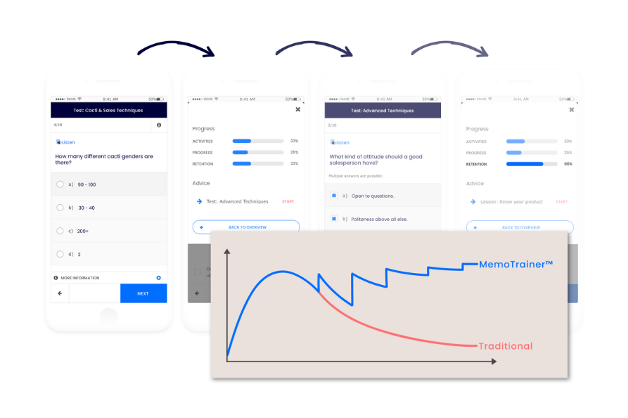 Help deelnemers de vergeetcurve te verslaan en ga voor de beste slagingspercentages. Onze MemoTrainer stuurt hen regelmatig herinneringen om in te checken en een aantal vragen over de leerstof te beantwoorden.