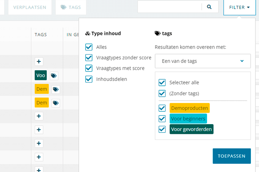 We hebben het mogelijk gemaakt om te zoeken en te filteren op inhoud die je zoekt. Tags kunnen dus ook gebruikt worden om op te filteren binnen de contentbibliotheek.