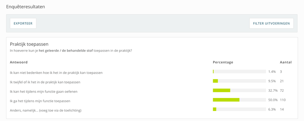 De beheerder kan de resultaten van de enquête filteren op uitvoering. Op deze manier kun je de verschillen in resultaten per uitvoering zien.