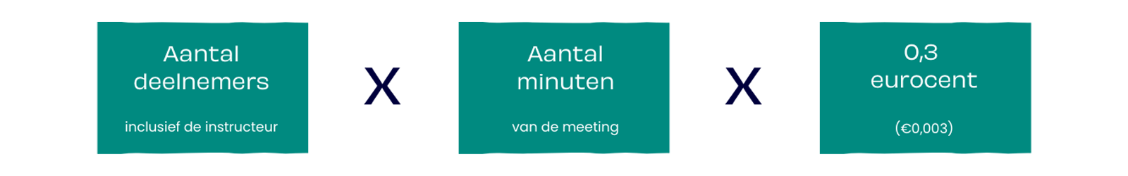 Stel dat je wekelijks een uur afspreekt met een groep van tien deelnemers als onderdeel van jouw cursus. Dan betaal je daar per online meeting 10 x 60 (minuten) x 0,3 eurocent = 1,80 euro voor. Per maand betaal je dan 1,80 x 4 meetings = 7,20 euro.